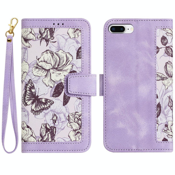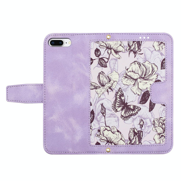 For iPhone 8 Plus / 7 Plus Floral Pattern Leather Phone Case with Lanyard(Light Purple)