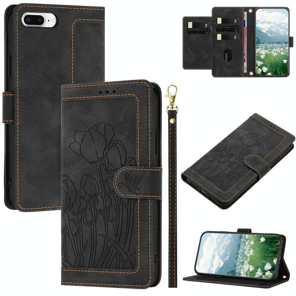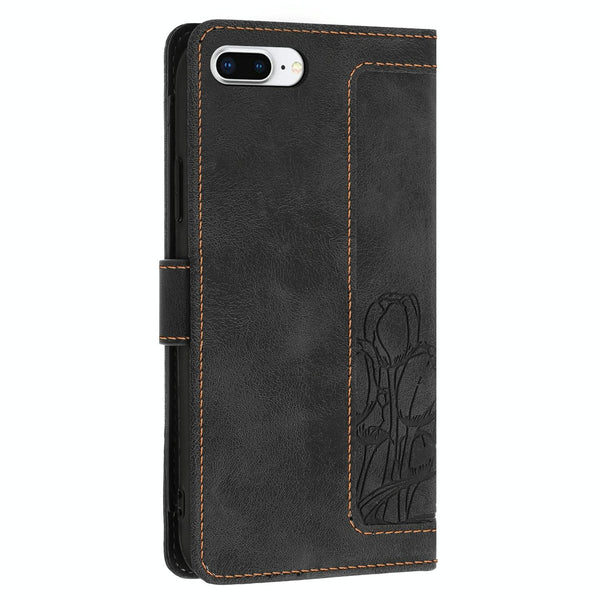 For iPhone 8 Plus / 7 Plus Tulips Embossed Leather Phone Case with Lanyard(Black)