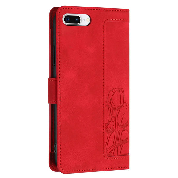 For iPhone 8 Plus / 7 Plus Tulips Embossed Leather Phone Case with Lanyard(Red)