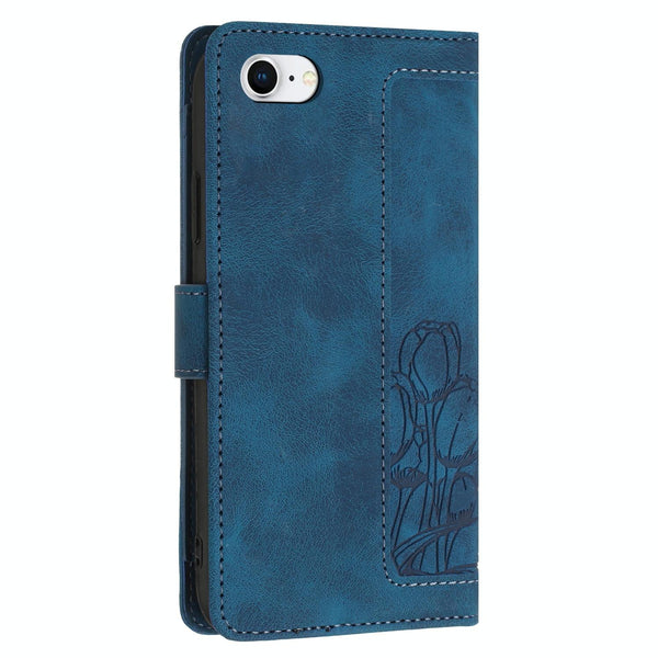 For iPhone SE 2022 / 2020 Tulips Embossed Leather Phone Case with Lanyard(Blue)
