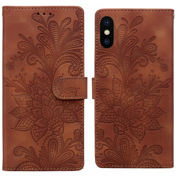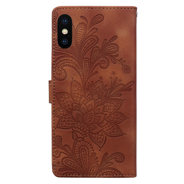 For iPhone X / XS Lace Floral Embossed Magnetic Buckle Leather Phone Case(Brown)