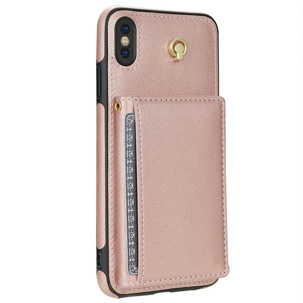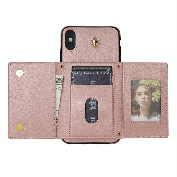 For iPhone X / XS Three Fold Card Bag Phone Case with Long Lanyard(Rose Gold)