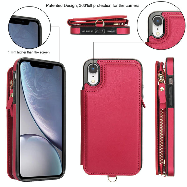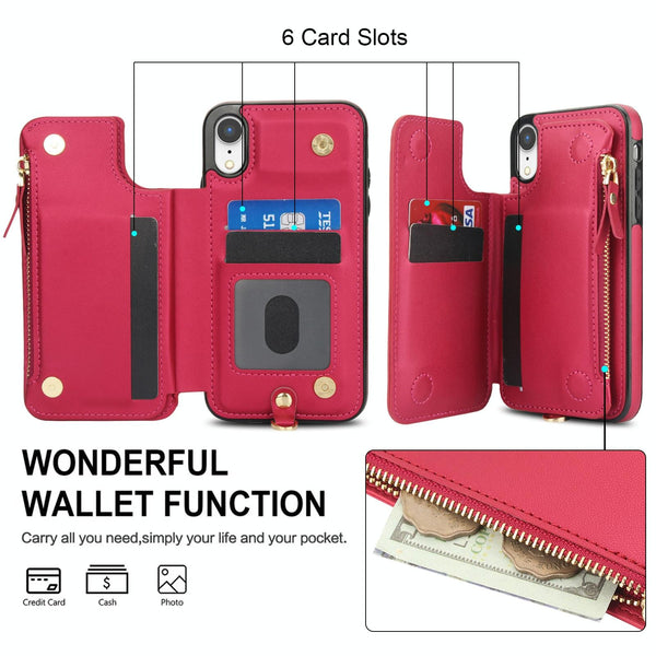 For iPhone XR Double Flap Zipper RFID Leather Phone Case with Short Lanyard(Red)