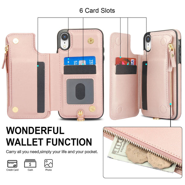 For iPhone XR Double Flap Zipper RFID Leather Phone Case with Short Lanyard(Rose Gold)
