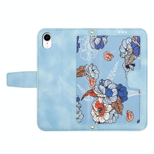 For iPhone XR Floral Pattern Leather Phone Case with Lanyard(Light Blue)
