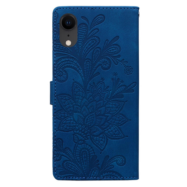 For iPhone XR Lace Floral Embossed Magnetic Buckle Leather Phone Case(Blue)
