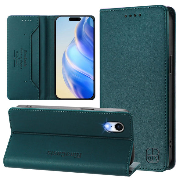 For iPhone XR RC01 Dual-Folded Magnetic Suction RFID Leather Phone Case(Dark Green)