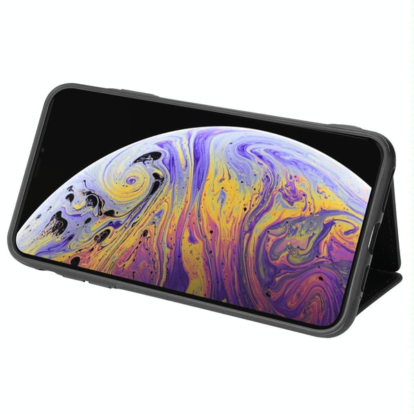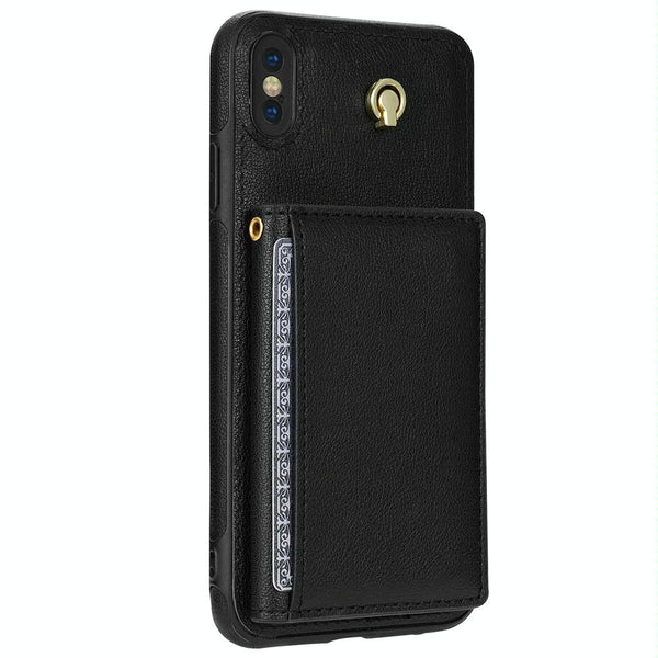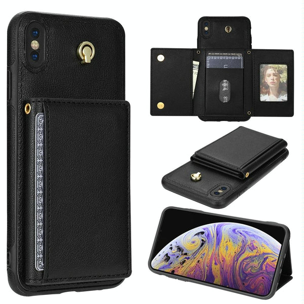 For iPhone XR Three Fold Card Bag Phone Case with Long Lanyard(Black)