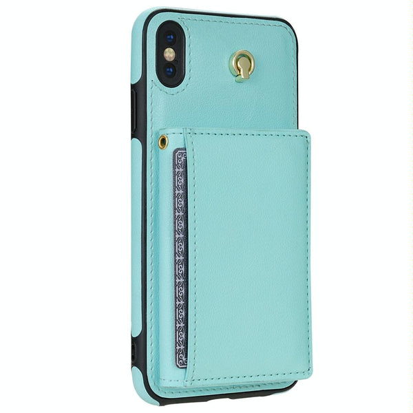 For iPhone XR Three Fold Card Bag Phone Case with Long Lanyard(Mint)