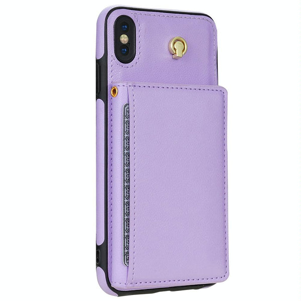 For iPhone XR Three Fold Card Bag Phone Case with Long Lanyard(Purple)