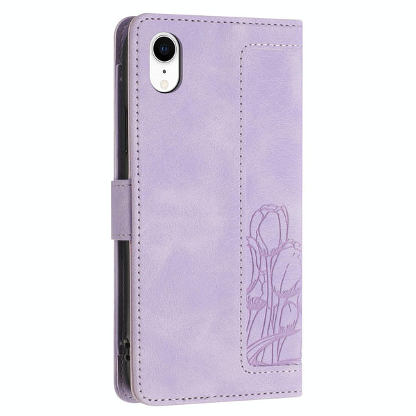For iPhone XR Tulips Embossed Leather Phone Case with Lanyard(Purple)