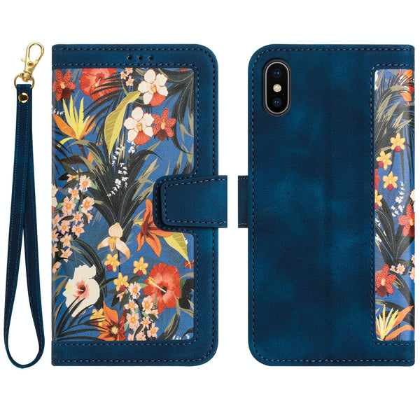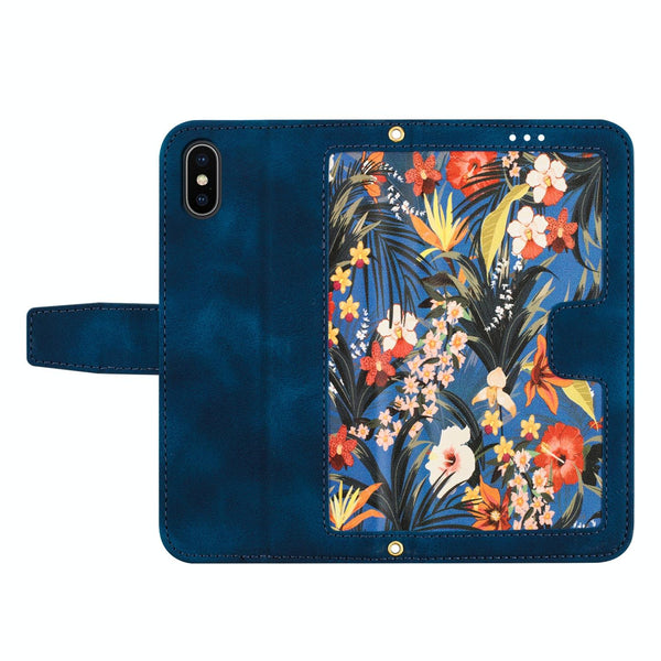For iPhone XS Max Floral Pattern Leather Phone Case with Lanyard(Dark Blue)
