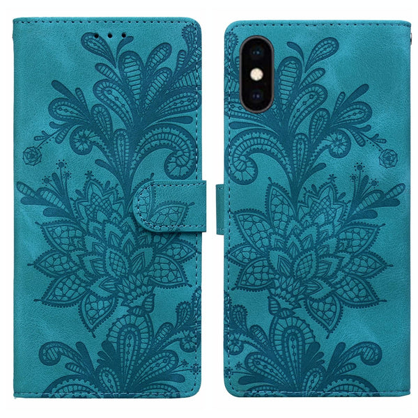 For iPhone XS Max Lace Floral Embossed Magnetic Buckle Leather Phone Case(Green)
