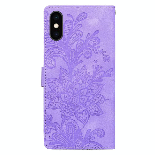 For iPhone XS Max Lace Floral Embossed Magnetic Buckle Leather Phone Case(Purple)