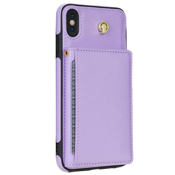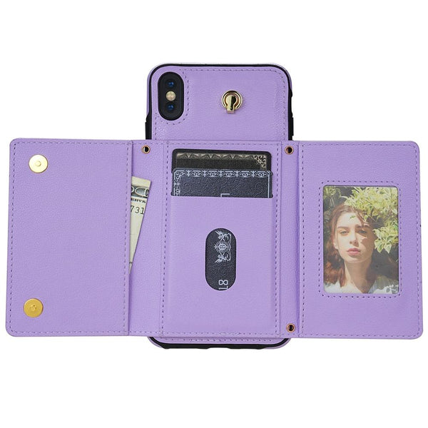 For iPhone XS Max Three Fold Card Bag Phone Case with Long Lanyard(Purple)