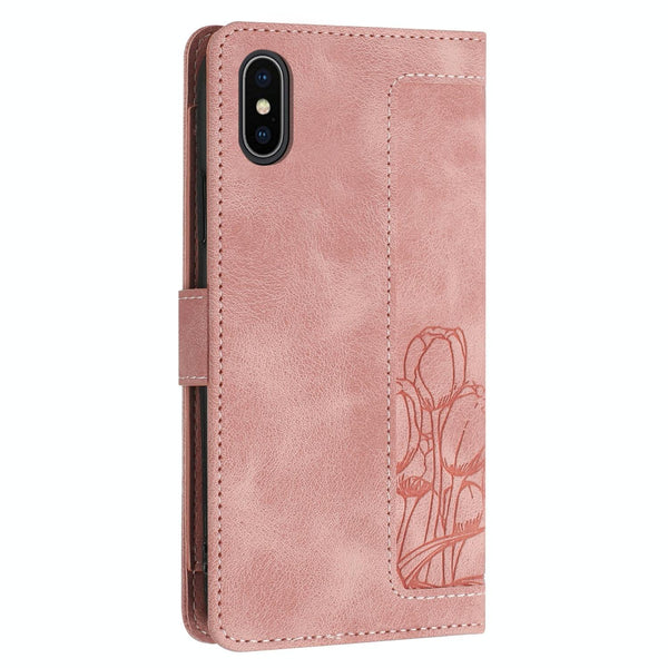 For iPhone XS / X Tulips Embossed Leather Phone Case with Lanyard(Pink)
