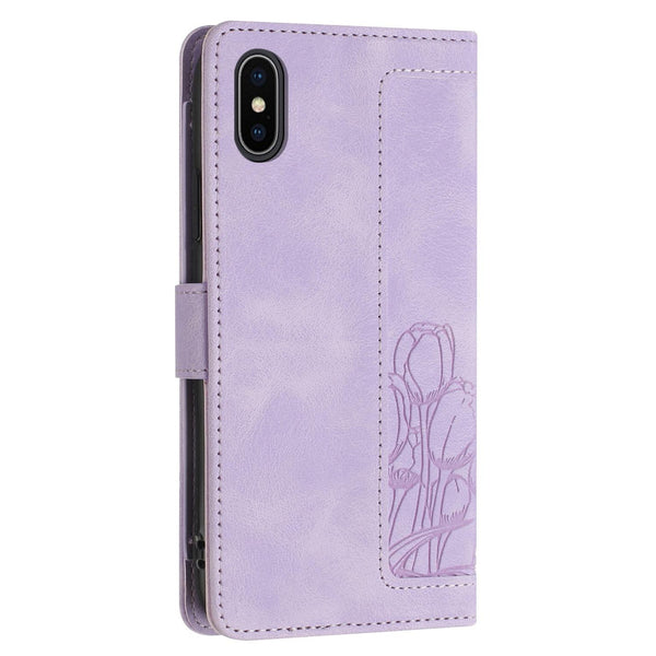 For iPhone XS / X Tulips Embossed Leather Phone Case with Lanyard(Purple)