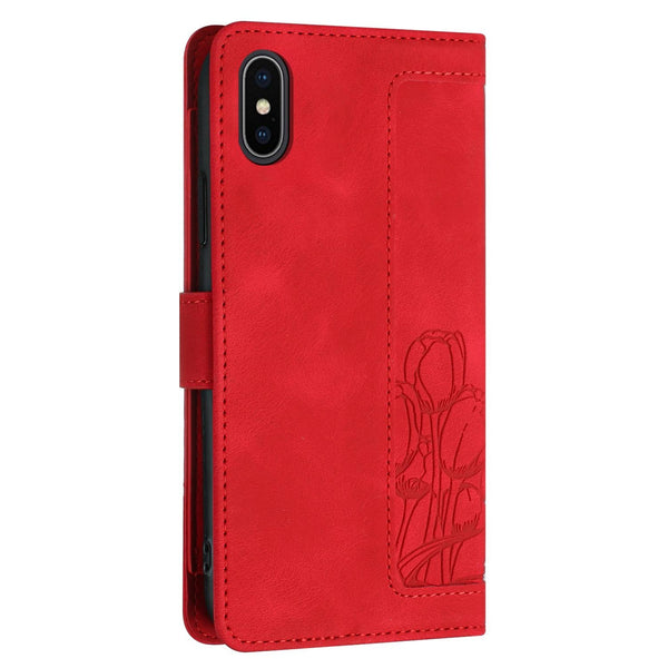 For iPhone XS / X Tulips Embossed Leather Phone Case with Lanyard(Red)