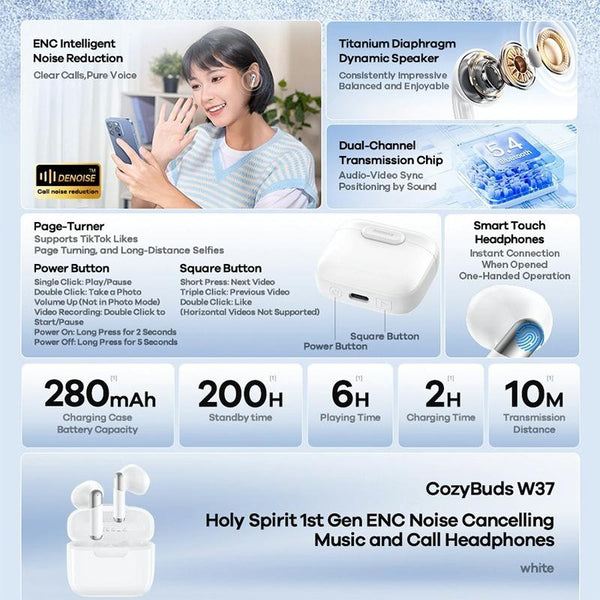 REMAX CozyBuds W37 ENC Noise Reduction Touch Wireless Bluetooth Earphone(White)
