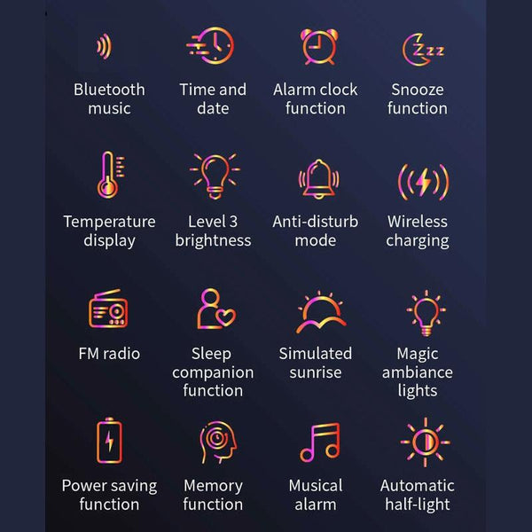 2. Not only an ambient light, but also has 15W fast wireless charging, Bluetooth speakers, music players, sleep lights, ambient lights, bedside lamps, sunrise simulation effects, clocks, alarm clocks, temperature displays, and FM radio functions.
