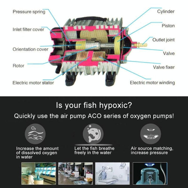 Keywords: fish tank air pump, aquarium air pump, seafood oxygenator, aquaculture aerator, 35W air compressor, 65L/min air pump, silent air pump, oil-free air pump, US plug air pump, 220V air pump, ACO-003
