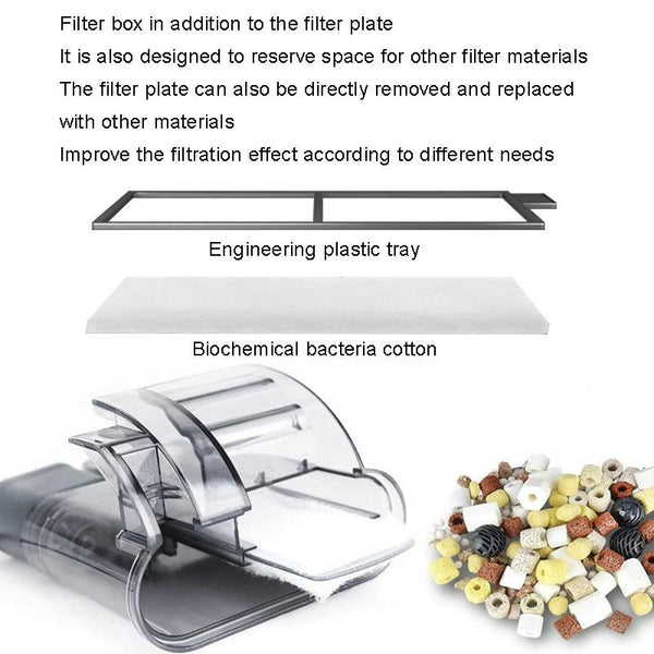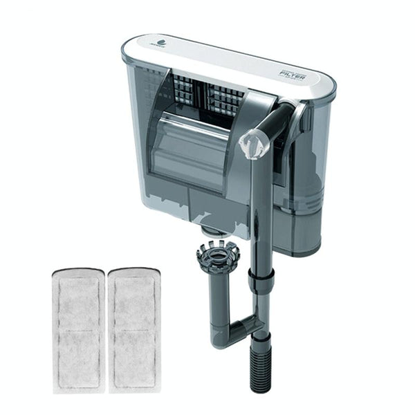 Upgrade your small aquarium with the Jeneca XP-09 External Waterfall Filter. This compact yet powerful filter (3.5W) delivers a 200L/H flow rate, perfect for tanks up to 40cm in length. Enjoy the soothing waterfall effect and efficient filtration, while the adjustable flow valve allows for customised water circulation. The innovative design includes a filter box with space for additional media, maximising filtration efficiency. An integrated oil film processor keeps the water surface pristine, while the self-floating suction head automatically adjusts to changing water levels. The transparent shell allows for easy monitoring, and the wall-mounted design simplifies installation. Quiet, energy-efficient operation is ensured by the ironless, magnetic damping-free motor. Comes with a CN plug and a 1.4m power cord. Dimensions: 18 x 5 x 38cm (approx.). Please note: fill the filter with water before initial use.