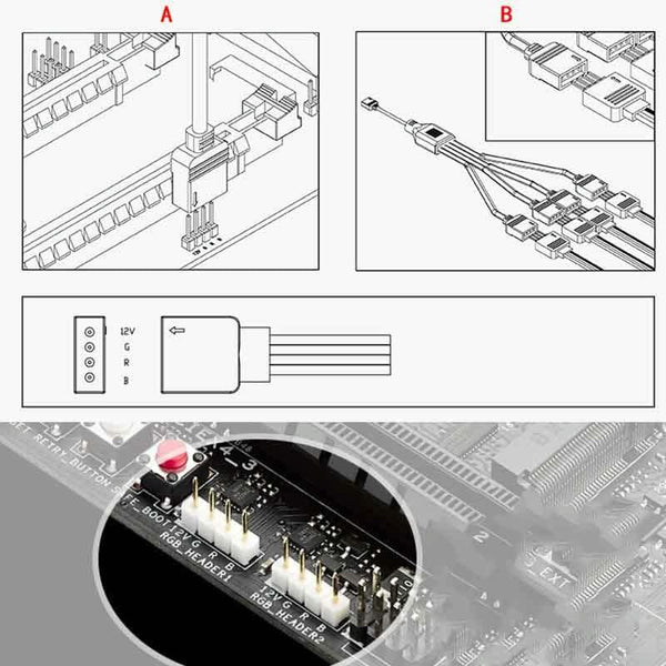 Extend your PC's vibrant RGB lighting with this 5V 3-Pin Aura RGB Motherboard Splitter Cable in sleek black. Designed for compatibility with popular motherboards like ASUS, MSI, and ASRock, this 30cm cable allows you to connect multiple addressable RGB (ARGB) devices to a single motherboard header. Durable and easy to install, this splitter cable ensures a secure connection for your RGB LED strips, fans, and other compatible accessories. Please note: This cable is specifically for 5V 3-pin ARGB components and does not support motherboard fan headers. Ensure your RGB devices use a compatible 5V 3-pin ARGB connector before purchase. Made from robust ABS plastic for long-lasting performance.