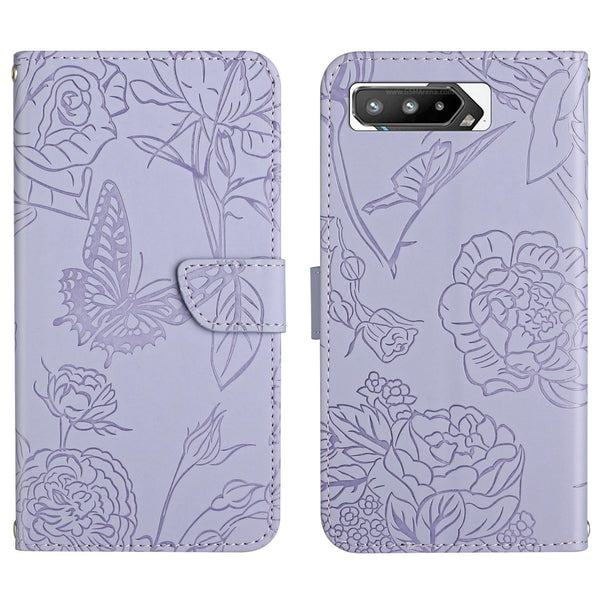 For Asus ROG Phone 5 ZS673KS Skin Feel Butterfly Peony Embossed Leather Phone Case(Purple)