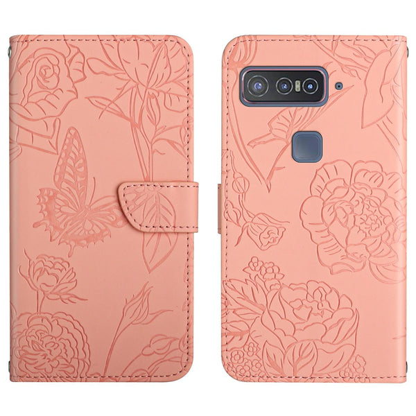 For Asus Smartphone for Snapdragon Insiders Skin Feel Butterfly Peony Embossed Leather Phone Case(Pink)