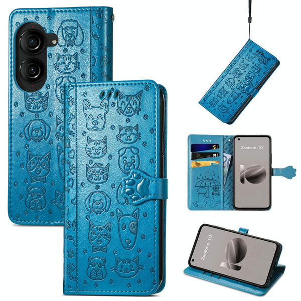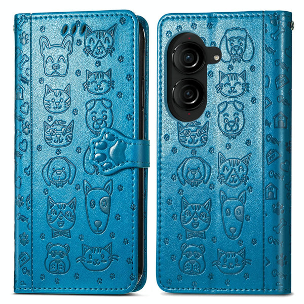 For ASUS Zenfone 10 Cat and Dog Embossed Leather Phone Case(Blue)