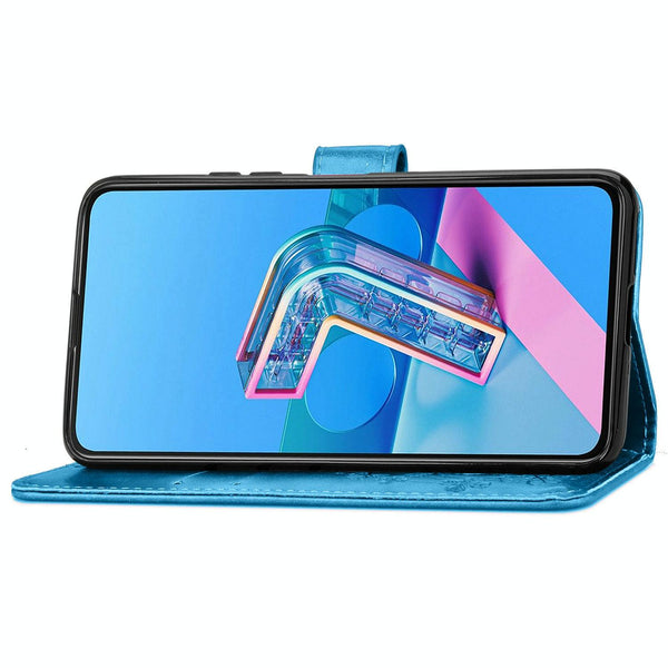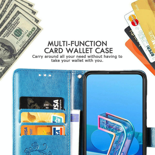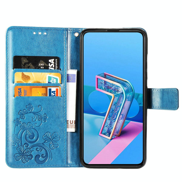 For Asus Zenfone 7 / 7 ProFour-leaf Clasp Embossed Buckle Mobile Phone Protection Leather Case with Lanyard & Card Slot & Wallet & Bracket Function(Blue)