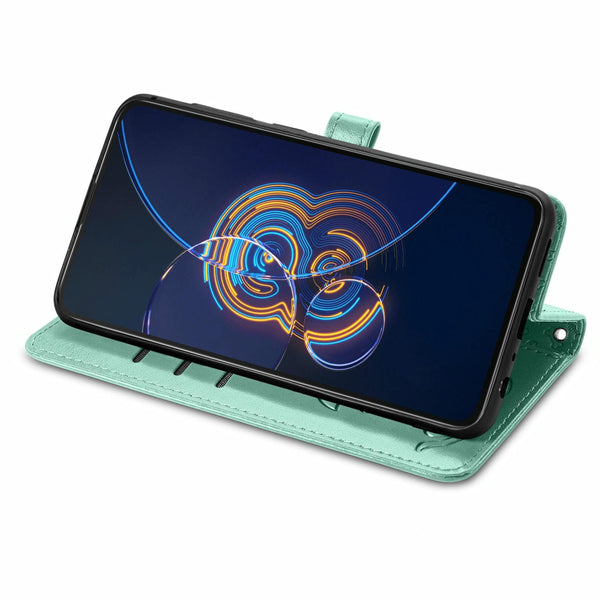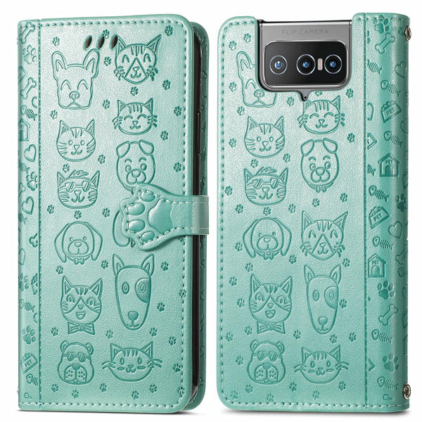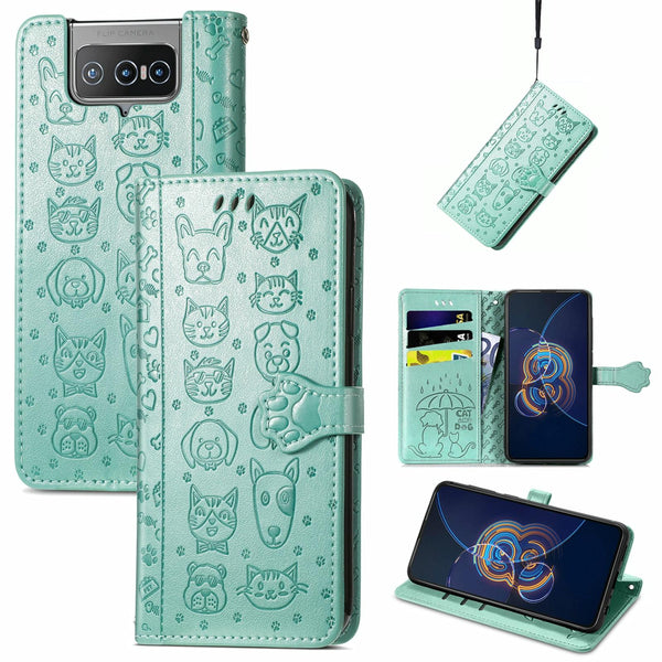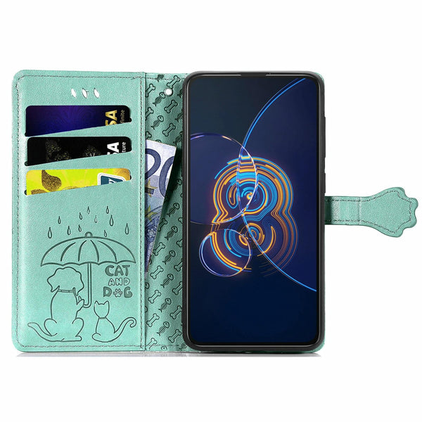 For Asus Zenfone 8 Flip Lovely Cat and Dog Embossing Pattern Horizontal Flip Leather Case , with Holder & Card Slots & Wallet & Cartoon Clasp & Lanyard(Green)