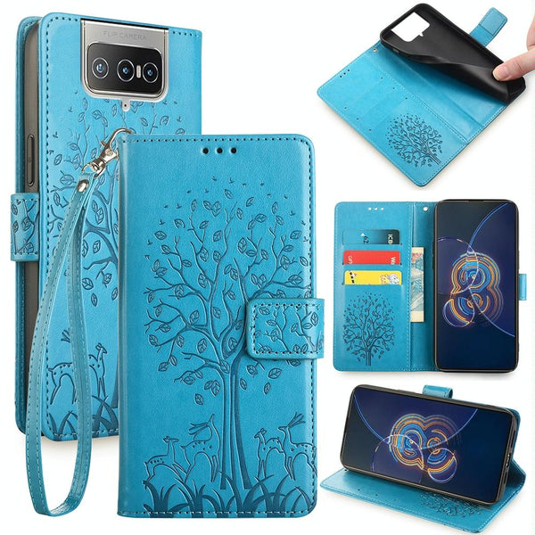 For Asus Zenfone 8 Flip Tree & Deer Embossed Leather Phone Case(Blue)