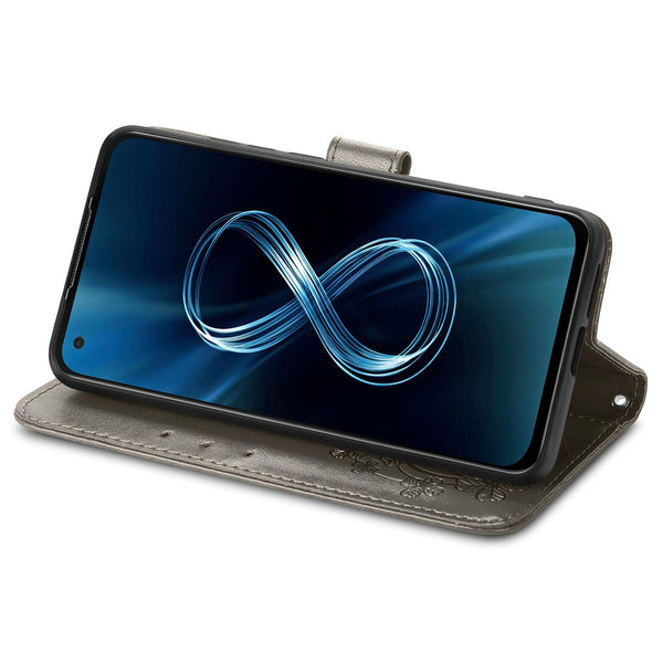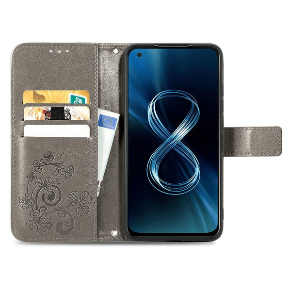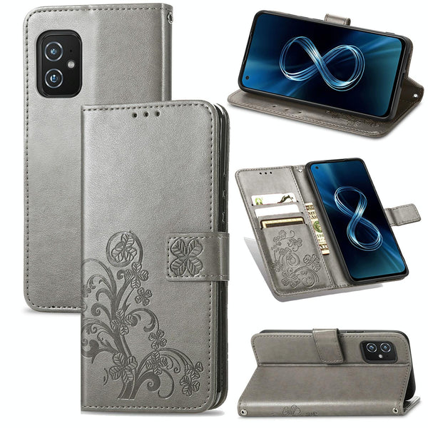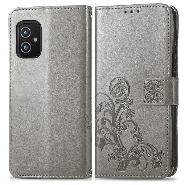 For Asus Zenfone 8 ZS590KS Four-leaf Clasp Embossed Buckle Mobile Phone Protection Leather Case with Lanyard & Card Slot & Wallet & Bracket Function(Gray)