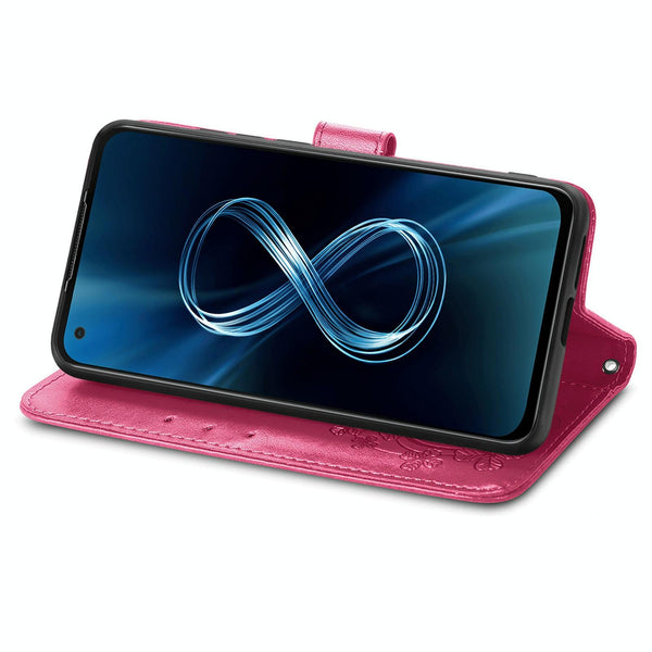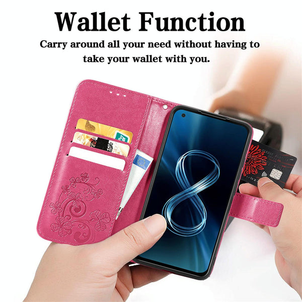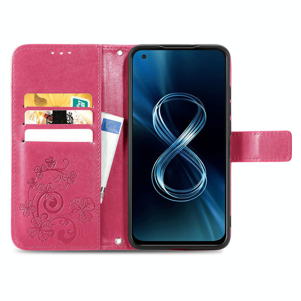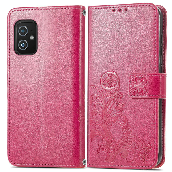 For Asus Zenfone 8 ZS590KS Four-leaf Clasp Embossed Buckle Mobile Phone Protection Leather Case with Lanyard & Card Slot & Wallet & Bracket Function(Magenta)