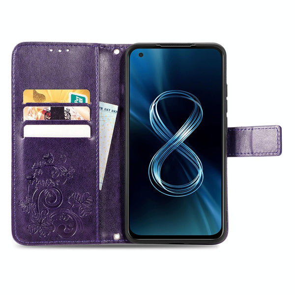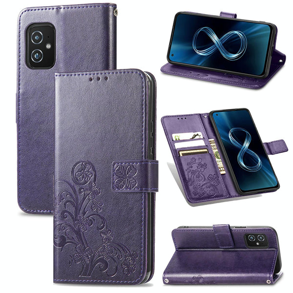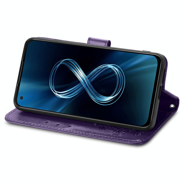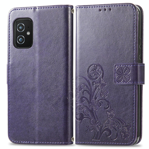 For Asus Zenfone 8 ZS590KS Four-leaf Clasp Embossed Buckle Mobile Phone Protection Leather Case with Lanyard & Card Slot & Wallet & Bracket Function(Purple)