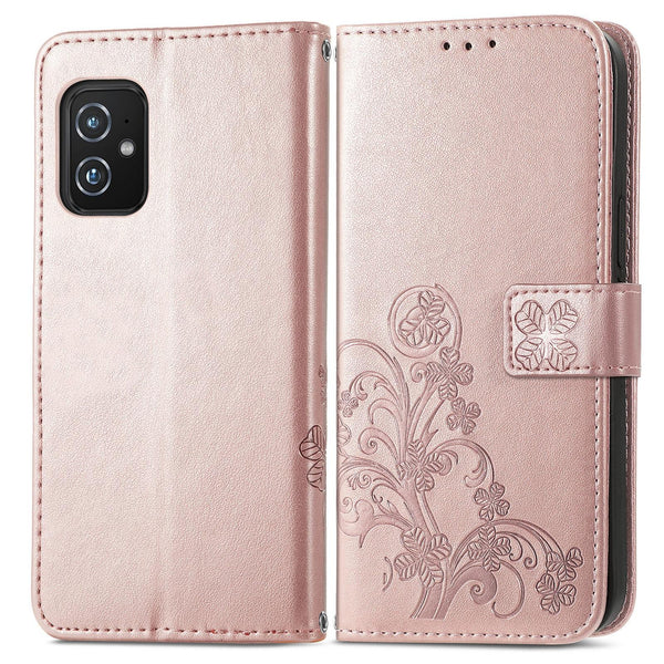 For Asus Zenfone 8 ZS590KS Four-leaf Clasp Embossed Buckle Mobile Phone Protection Leather Case with Lanyard & Card Slot & Wallet & Bracket Function(Rose Gold)
