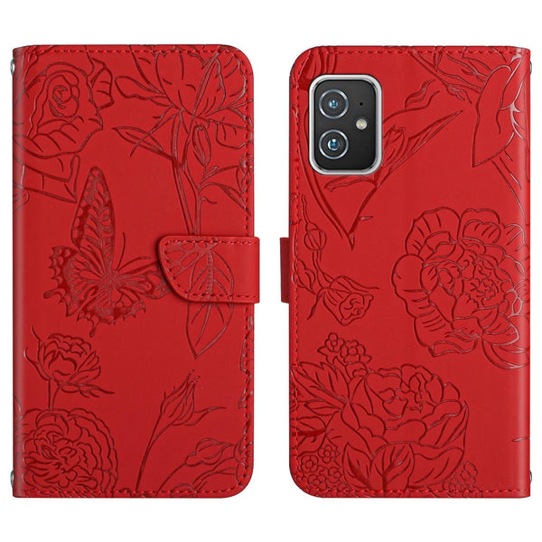 For Asus ZenFone 8 ZS590KS Skin Feel Butterfly Peony Embossed Leather Phone Case(Red)