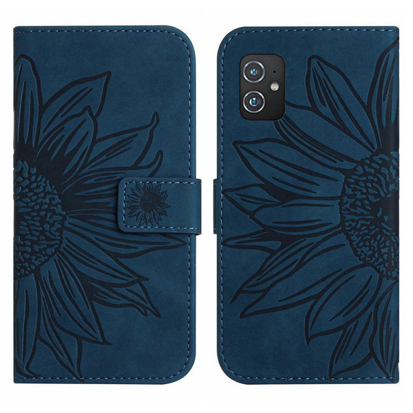 For Asus ZenFone 8 ZS590KS Skin Feel Sun Flower Pattern Flip Leather Phone Case with Lanyard(Inky Blue)