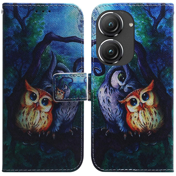For Asus Zenfone 9 Coloured Drawing Leather Phone Case(Oil Painting Owl)