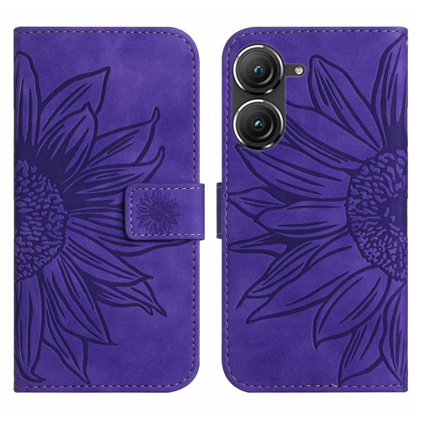 For Asus ZenFone 9 Skin Feel Sun Flower Pattern Flip Leather Phone Case with Lanyard(Dark Purple)
