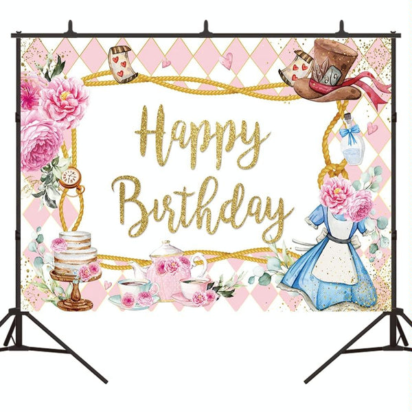 210 x 150cm Pink Flowers Cake Cartoon Birthday Background Cloth Birthday Decoration Banner Hanging Flags