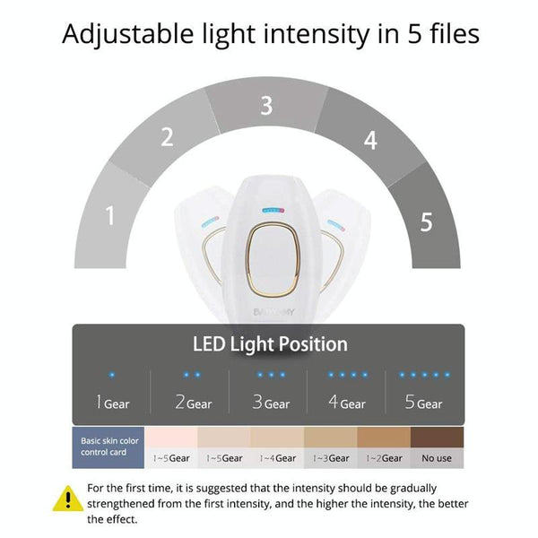 5. 5 kinds of energy intensity: 5 levels of light intensity adjustment to meet your different needs. With skin color detection indicator. Exclusive skin detection system, eye safety system: light only when in contact with the skin.