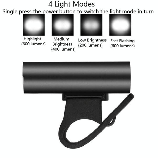 9. Lighting modes: four, high brightness (600 lumens) / medium brightness (400 lumens) / low brightness (200 lumens) / fast flashing (600 lumens), single press the power button to switch the lighting mode in turn