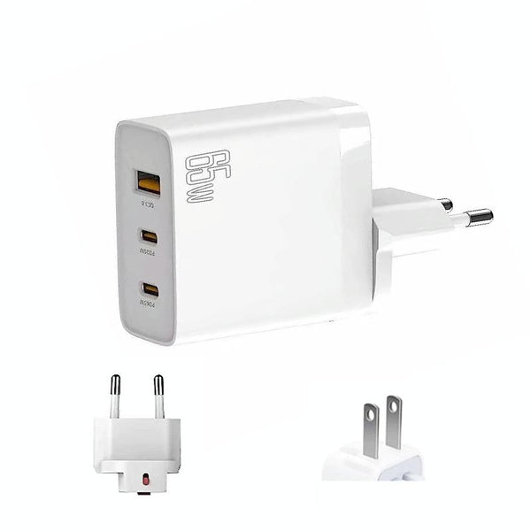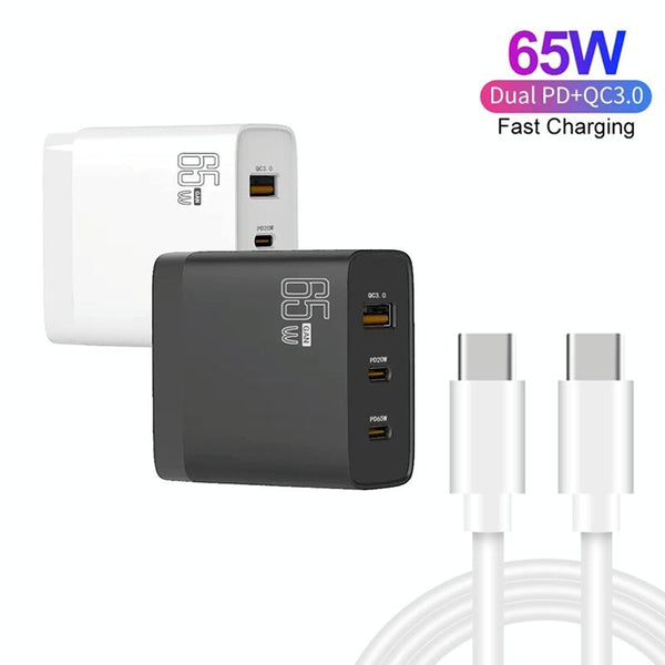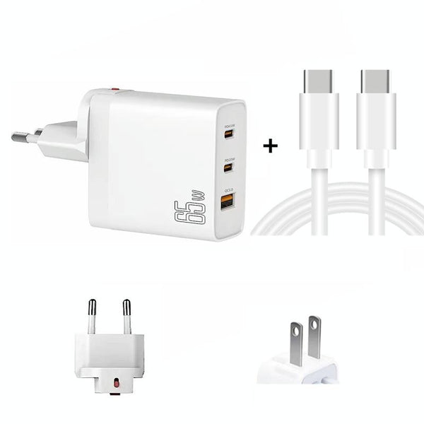 GAN 65W PD45W Dual Type-C / QC3.0 USBMulti Compatible Charger + 2m USB-C to USB-C Data Cable EU + US Plug White
