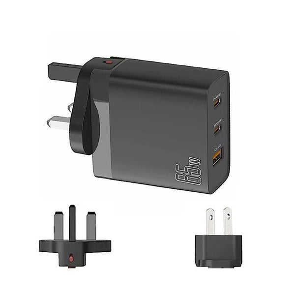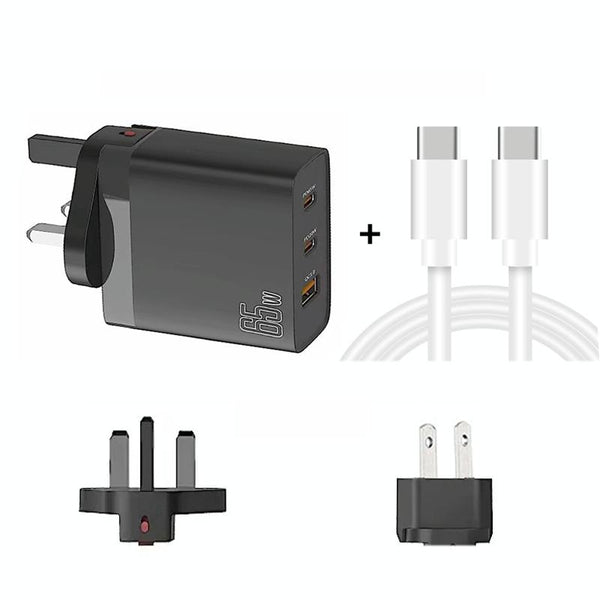 GAN 65W PD45W Dual Type-C / QC3.0 USBMulti Compatible Charger + 2m USB-C to USB-C Data Cable UK + US Plug Black