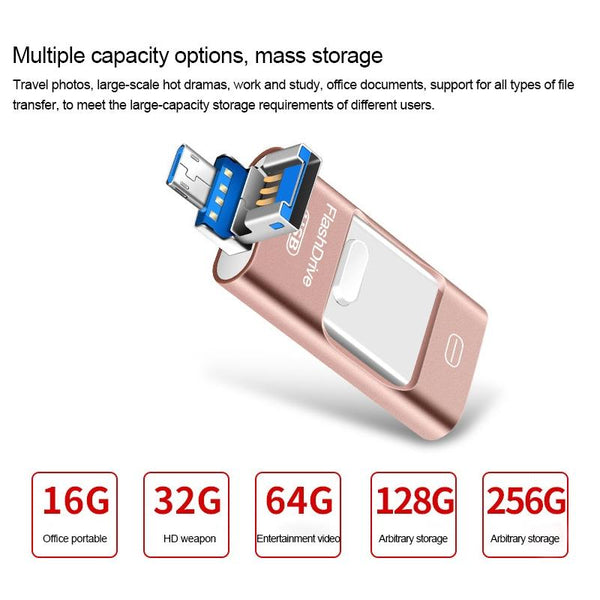 128GB USB 3.0 + 8 Pin + Mirco USB Android iPhone Computer Dual-use Metal Flash Drive (Rose Gold)