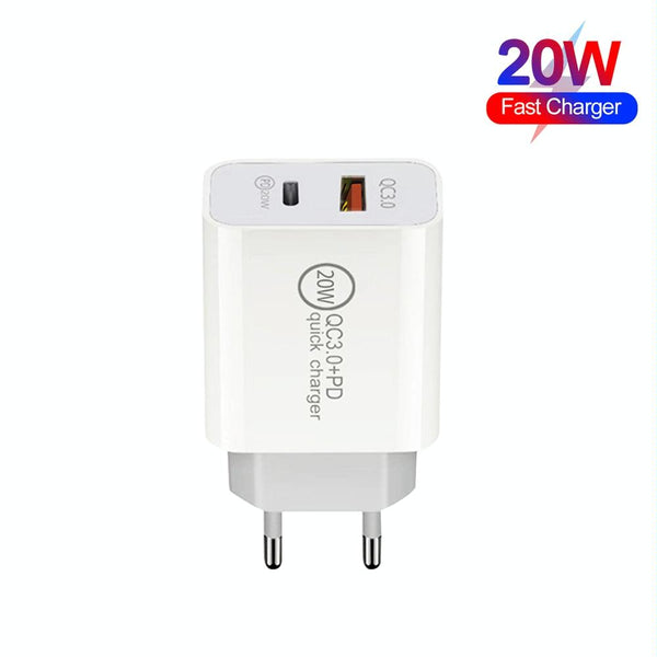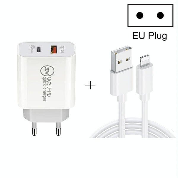 20W PD Type-C + QC 3.0 USB Interface Fast Charging Travel Charger with USB to 8 Pin Fast Charge Data Cable EU Plug