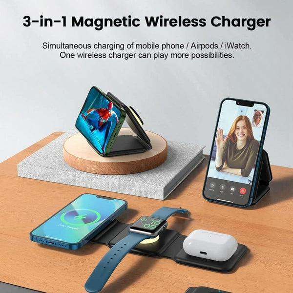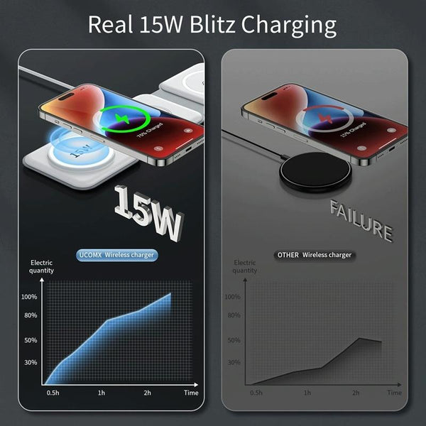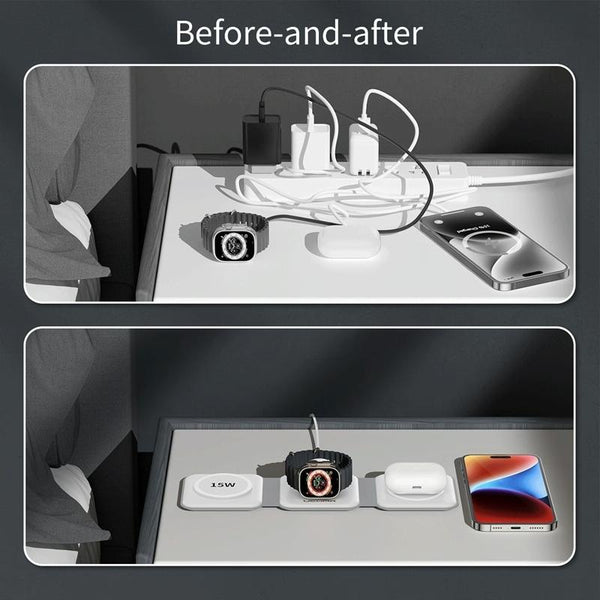 3. Just place your devices on the 3 in 1 charging station to enjoy fast wireless charging. The upgraded coils can increase the power conversion rate by 35% with the takes about 2-3 hours for full charge. The charging board is covered with magnetic attraction, not slip off. Put the phone on the charging pad it will auto-align exactly to the best charging position. (only iPhone 15/14/13/12 series supports the magnetic suction)