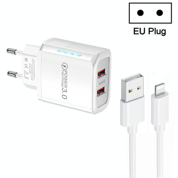 36W Dual Port QC3.0 USB Charger with 3A USB to 8 Pin Data Cable, EU Plug(White)